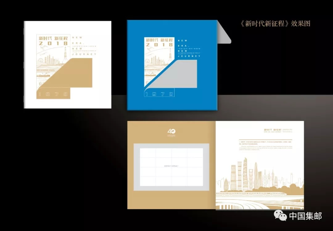 - 商品详情:《新时代 新征程》邮册设计简洁大方,着重体现19大之后的新局面。插套采用蓝色主色调,意指描绘改革开放四十周年后新时代的蓝图。封面插套图形创意为“翻开新的篇章”,表达改革开放四十年在取得辉煌成就后,中国领导人带领人民继续奋发图强,在新的时代里踏上新的征程,继续为中华民族的繁荣富强而努力。其中画面选用新时代千年大计——雄安、京津冀协同发展、“1带1路”、高铁等,表达改革开放以来的成就和新的伟大蓝图。