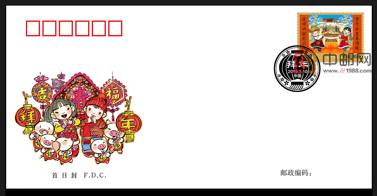 商品详情:贴2019《拜年》邮票,销首日纪念戳。
