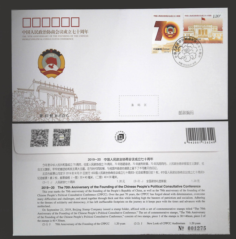 S总 《2019-20 中国人民政治协商会议成立七十周年》总公司首日封