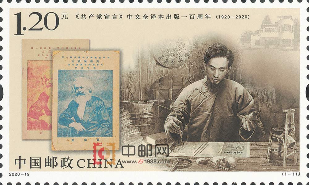 中国邮政定于2020年8月22日发行《<共产党宣言>中文全译本出版一百周年》纪念邮票1套1枚。详情如下: