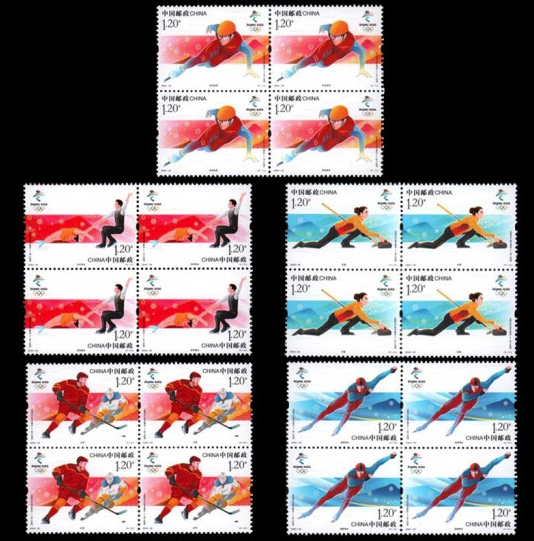 中国邮政定于2020年11月7日发行《北京2022年冬奥会——冰上运动》纪念邮票一套5枚。邮票图案名称分别为:短道速滑、花样滑冰、速度滑冰、冰壶、冰球。全套面值6元,计划发行量版式一870万套,版式二200万套(100万版)。