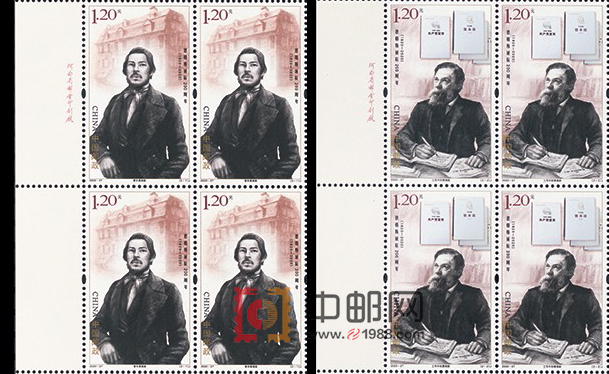 中国邮政定于2020年11月28日发行《恩格斯诞辰200周年》纪念邮票一套2枚。邮票图案名称分别为:青年恩格斯、工作中的恩格斯。全套邮票面值为2.40元。计划发行数量为750万套。