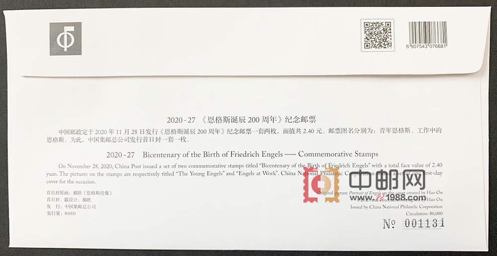 S总《2020-27 恩格斯诞辰200周年》集邮总公司首日封