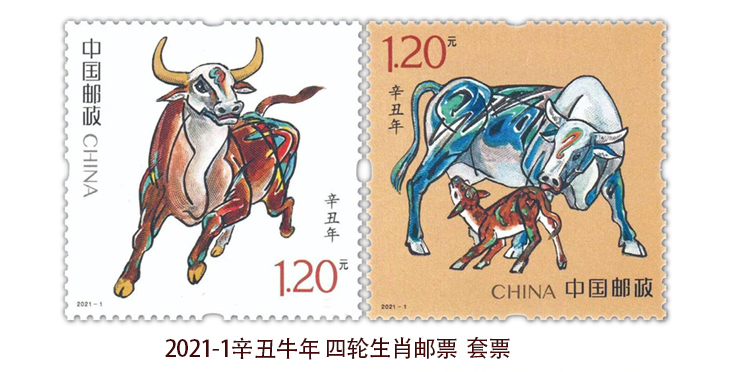 - 商品详情:中国邮政定于2021年1月5日发行《辛丑年》特种邮票一套2枚,邮票图案名称分别为:奋发图强、牛年大吉,全套邮票面值为2.40元。计划发行量分别为邮票一图4460万枚,邮票二图4280万枚,版式二250万版,小本票630万本。