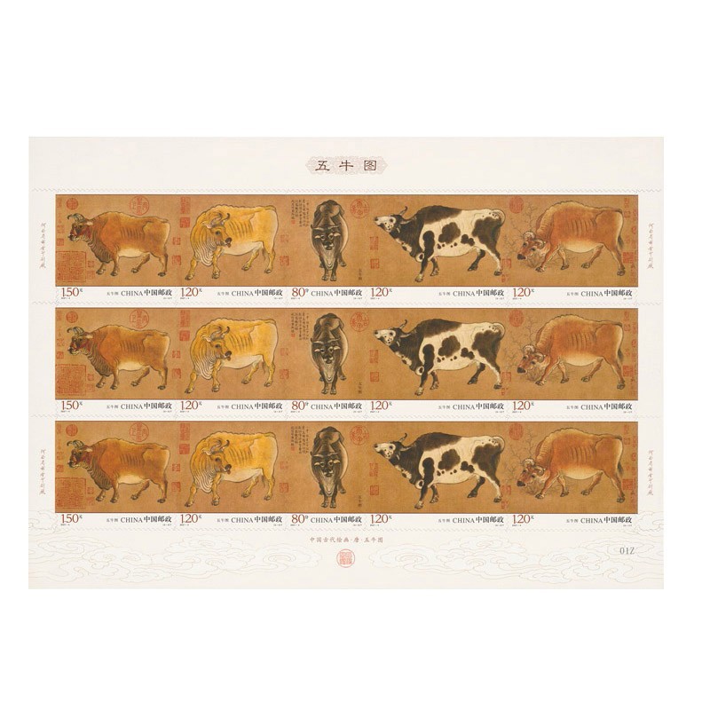 - 商品详情: 中国邮政定于2021年3月20日发行《五牛图》特种邮票一套5枚,小型张1枚。全套邮票面值5.90元,小型张售价6元。邮票计划发行数量720万套,小型张计划发行数量630万枚,另发行本票册一本,售价50元,计划发行数量10万本。