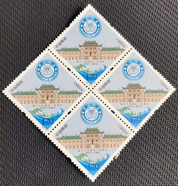 该套邮票采用电脑手绘表现方式,以厦门大学的标志性建筑之一——群贤楼群为主体,同时表现了校徽、建南大会堂及海浪等元素,采用菱形设计,画面构图严谨、层次分明,色调清新淡雅,充分彰显出厦门大学深厚的历史底蕴、蓬勃的时代气息和浓郁的地域特色。邮票版式一借鉴传统中国结的造型符号,采用中轴对称的形式进行设计,同时以剪影方式表现了群贤楼群、校训及百年校庆标志,整体画面富有秩序感和节奏感。