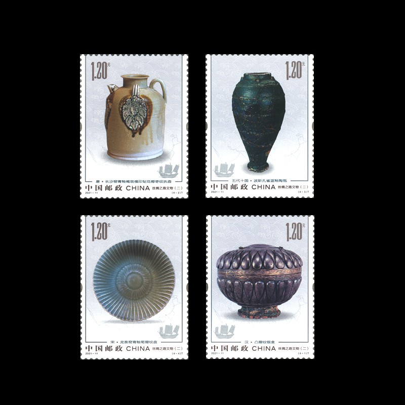 - 商品详情:为了弘扬“丝路精神”,中国邮政定于2021年6月12日发行《丝绸之路文物(二)》特种邮票一套4枚,邮票图案内容分别为汉·凸瓣纹银盒、唐·长沙窑青釉褐斑模印贴花椰枣纹执壶、五代十国·波斯孔雀蓝釉陶瓶、宋·龙泉窑青釉菊瓣纹盘。全套邮票面值为4.80元,邮票计划发行数量735万套。