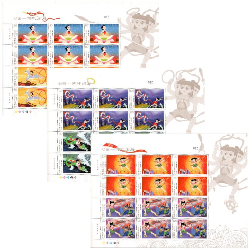 《动画——哪吒闹海》邮票表现了动画中哪吒出世、童年游趣、擒拿敖丙、斗战龙王、哪吒重生、定海安民6个故事情节,画面不仅呈现了哪吒天真、可爱的性格,还表现了他不畏权威、争取正义的可贵精神。6枚邮票分别采用6种色调,色彩特征鲜明、连贯,展现了不同动态的人物形象。整体设计借鉴电影中蒙太奇的表现手法,将不同时间、场景、镜头画面重组、拼接,在静止的邮票中呈现出完整的动画情节,还原了很多人心中的一段童年记忆。