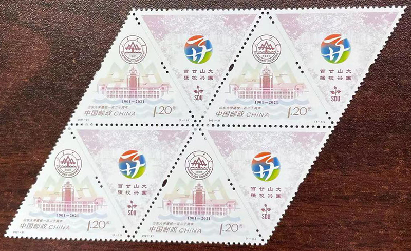 该套邮票画面以山东大学LOGO作为主要元素,LOGO部分的图形元素作为背景,进一步诠释主题,整体画面简洁,主题突出。