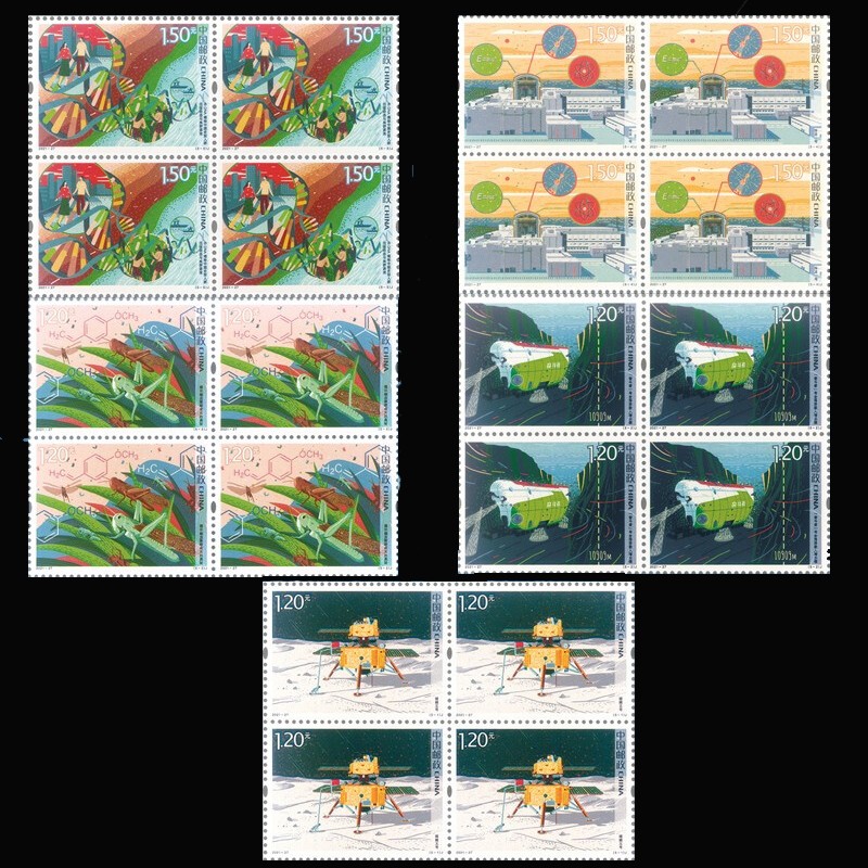该套邮票由杜钰凯设计,画面延续前两组的系列特点,采用现代手绘插画方式表现,色彩鲜亮明快,画面清新自然。图一主要表现了“嫦娥五号”月球探测器首次实施无人月面取样的工作场景,为中国探月工程三期的收官之战;图二展现的“奋斗者”号全海深载人潜水器是我国首台具备全球海域载人进入能力的重要装备,也是当前全球同类型载人潜水器中载员人数最多、海底作业时间最长、作业能力最强的装备;图三“揭示蝗虫聚群成灾的奥秘”通过蝗虫聚集、4VA化学式等场景画面,表现了化合物4-乙烯基苯甲醚(4VA)是飞蝗群聚信息素这一昆虫学研究重大突破,该研究使蝗虫的绿色和可持续防控成为可能;图四以“华龙一号”为主画面,辅以能量公式、核裂变等元素符号,展现了我国具有完全自主知识产权的第三代压水堆核电创新成果,这一成果标志着我国核电技术水平和综合实力已跻身世界第一方阵;图五以古今对比、DNA链、古地层等为表现元素,形象展现了“古DNA揭秘中国史前人群迁徙动态与族群源流”的画面主题。该成果填补了东方尤其是中国地区史前人类遗传、演化、适应方面的重要信息。