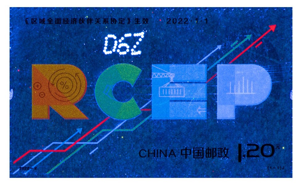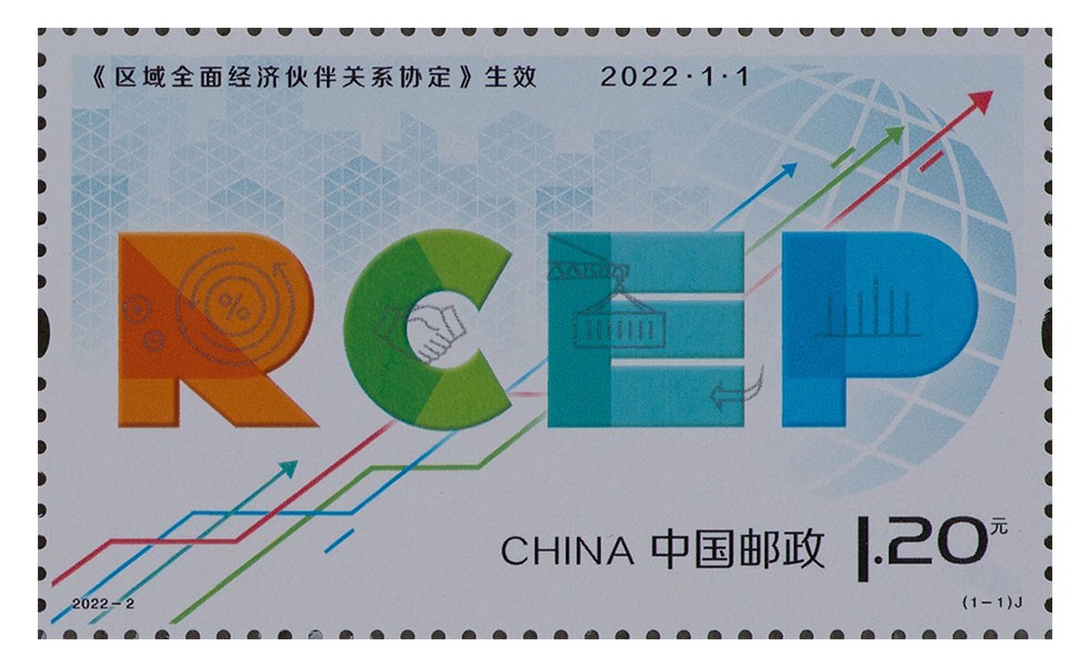 - 商品详情:中国邮政定于2022年1月1日发行《<区域全面经济伙伴关系协定>生效》纪念邮票一套1枚,全套邮票面值1.20元,邮票计划发行数量为680万套。