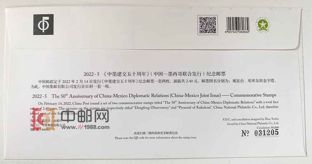 S总2022-5 《中墨建交五十周年》首日封(中国集邮总公司)