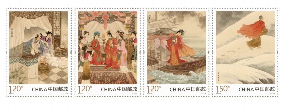 中国邮政定于2022年4月23日发行《中国古典文学名著——<红楼梦>(五)》特种邮票一套4枚,小型张1枚。邮票图案名称分别为:黛玉焚稿、金玉联姻、探春远嫁、宝玉却尘,小型张图案名称为:寒塘鹤影。全套邮票面值为11.10元。邮票计划发行数量为860万套,小型张计划发行数量为598万枚。