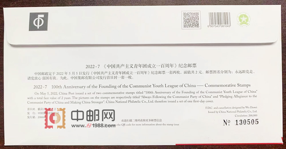 S总 2022-7《中国共产主义青年团成立一百周年》(集邮总公司)