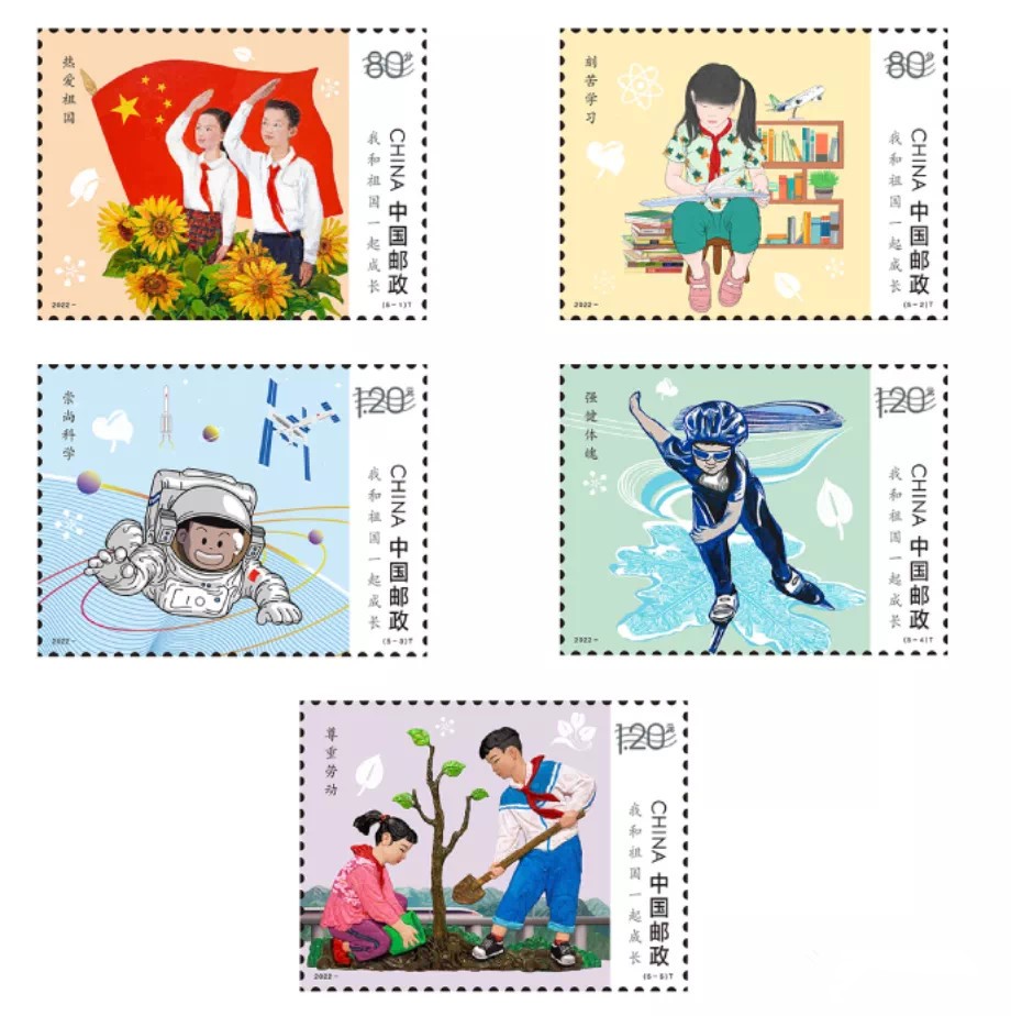 中国邮政定于2022年6月1日发行《我和祖国一起成长》特种邮票1套5枚。详情如下: