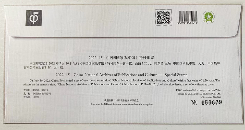 S总2022-15《中国国家版本馆》(集邮总公司首日封)