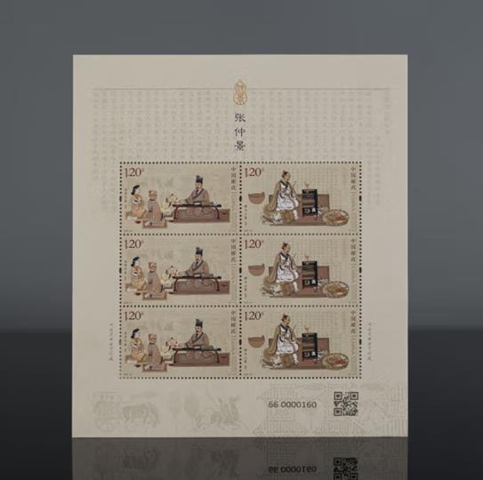 邮票第1枚“坐堂行医”,画面表现了张仲景任长沙太守时,开放公堂为百姓治病的场景。邮票第2枚“撰书立著”,画面表现了张仲景编撰《伤寒杂病论》、著书研医的生动场景,背景运用《白云阁藏本<伤寒杂病论>序》,突出主题。小型张“张仲景像”,人物线条挺劲流畅、形象刻画生动,塑造了张仲景施仁术、济苍生的大医气度。画面背景衬以小柴胡汤方原文,凸显博大精深的中医药文化。