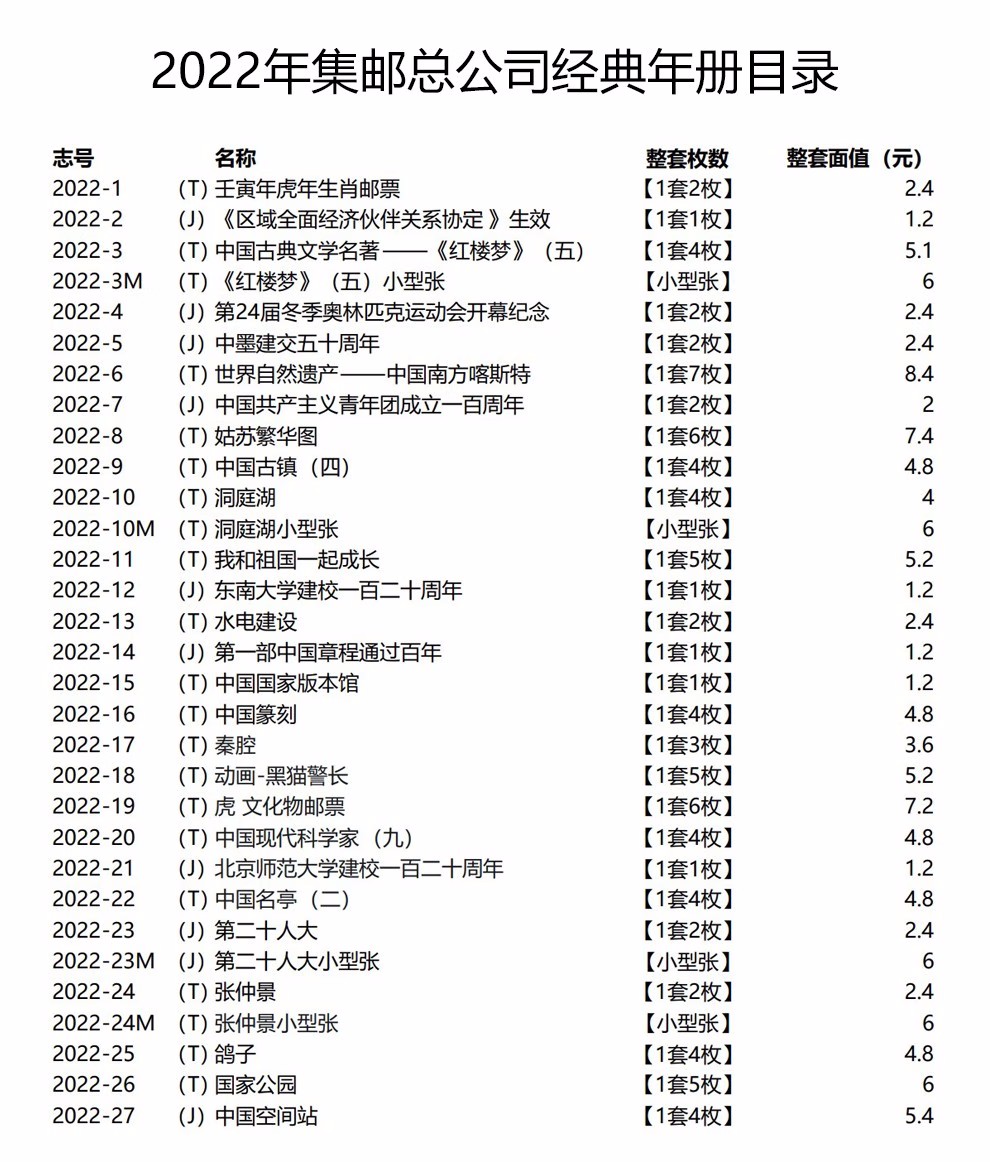 集邮总公司中档册,内含以下所列邮品,不包含2022年评选纪念张(未发行,预计2023年5-6月发行)