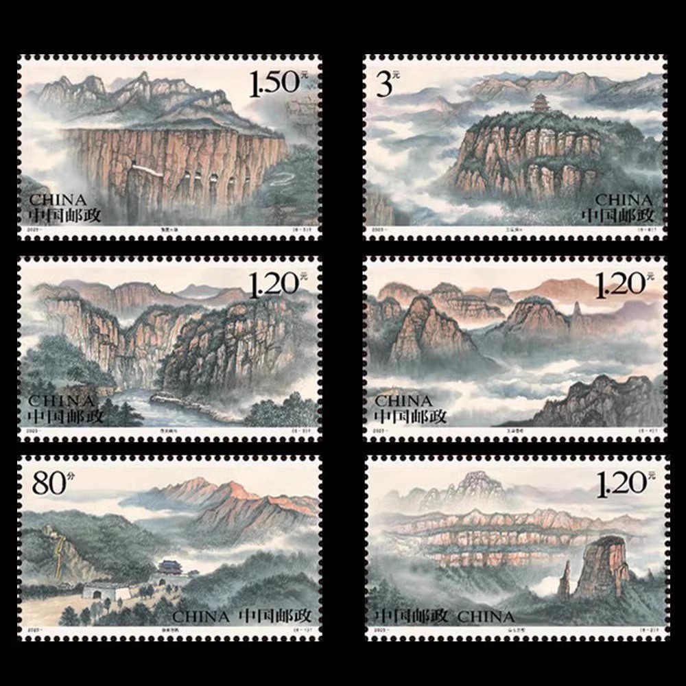 - 商品详情: 中国邮政定于2023年9月3日发行《太行山》特种邮票一套6枚,邮票图案名称为雄关险踞、白石赤壁、壶关幽谷、王莽奇峰、郭亮天路和王屋洞天。全套邮票面值8.90元。邮票计划发行数量为套票671.5万套、版式二83.5万版。