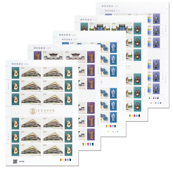 该套邮票采用主附票设计形式。主票体现了5座博物馆建筑特色,简洁雅致的色彩、清晰有力的线条,彰显出稳定而极富张力的建筑美感;附票为各馆推荐的重要文物,展现出我国灿烂的传统文化和悠久的历史传承。第一枚中国考古博物馆是由中国历史研究院建立的国内第一家以考古命名的国家级专业博物馆。该馆以“历史中国,鼎铸文明”为主题,以“仓储式陈列,沉浸式体验”为特色,集展览展示、收藏保护、学术研究、宣传教育为一体。附票表现商代嵌绿松石象牙杯,为商晚期牙雕,1976年在河南省安阳市殷墟妇好墓出土,被列入《首批禁止出国(境) 展览文物目录》。第二枚辽宁省博物馆是一座现代化的大型综合历史与艺术类博物馆,其前身为1949年创建的东北博物馆,是新中国建立的第一座博物馆,1959年改称辽宁省博物馆。附票表现新石器时代玉玦形龙,为目前已知红山文化玦形玉猪龙中形体较大、形制最规整的一件。第三枚湖北省博物馆是国家一级博物馆,馆藏文物体系完整、数量丰富、质量精湛、地域特色鲜明,在国内外享有盛誉。附票表现元代青花四爱图梅瓶,梅瓶腹部分别绘王羲之爱兰图,陶渊明爱菊图,周敦颐爱莲图,林和靖爱梅、鹤图。第四枚湖南博物院是湖南省最大的历史艺术类博物馆,是首批国家一级博物馆,馆藏文物中尤以马王堆汉墓出土文物、商周青铜器、楚文物、历代陶瓷、书画和近现代文物等最具特色。附票表现商代皿方罍,该皿方罍器型硕大,雄浑庄重,雕刻精美,富丽堂皇,是中国晚商青铜器鼎盛时期的代表之作,充分反映了中国青铜器铸造的高超技艺和摄人心魄的气势。第五枚三星堆博物馆,其新馆对标世界一流博物馆建设,是目前西南地区最大的遗址类博物馆单体建筑。馆内文物生动揭示出古蜀文明的灿烂辉煌,彰显着中华文化永久魅力和时代风采。附票表现商代铜扭头跪坐人像,从造型、纹饰等方面来说都是三星堆考古全新的发现,对研究三星堆的青铜铸造技术及艺术、宗教信仰与社会体系、与周边地区的文化交流具有重要意义。
