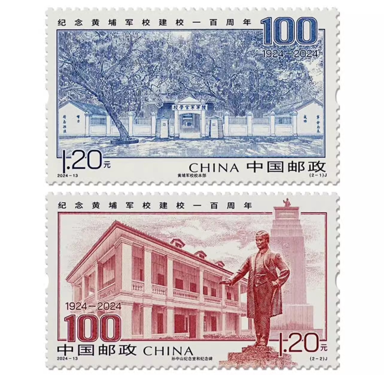 中国邮政定于2024年6月16日发行《纪念黄埔军校建校一百周年》纪念邮票1套2枚,邮票图案名称为:黄埔军校校本部、孙中山纪念室和纪念碑。全套邮票面值2.40元,计划发行数量665万套。