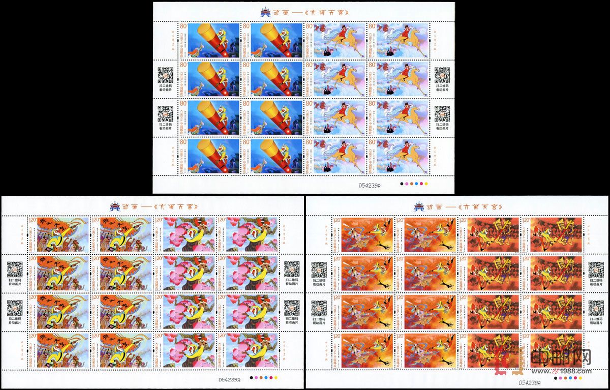 中国邮政定于2014年6月1日发行《动画--大闹天宫》特种邮票,全套六枚,同时发行小本票一本,编号(51)。六枚邮票将展现第一枚:龙宫夺宝(80分) 第二枚:官封弼马温(80分) 第三枚:智封齐天大圣(1.20元) 第四枚:大闹蟠桃园 (1.20元) 第五枚:勇斗天兵天将(1.20元) 第六枚:打上灵霄殿(1.20元) ,邮票票幅50x30mm。