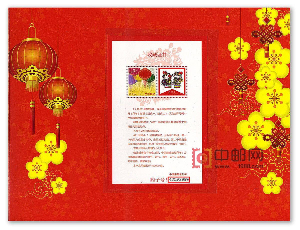 大拜年邮票珍藏邮折,内含中国邮政发行的吉祥号码《拜年》邮票(版式一、版式二),以及吉祥号码个性化邮票收藏证书。